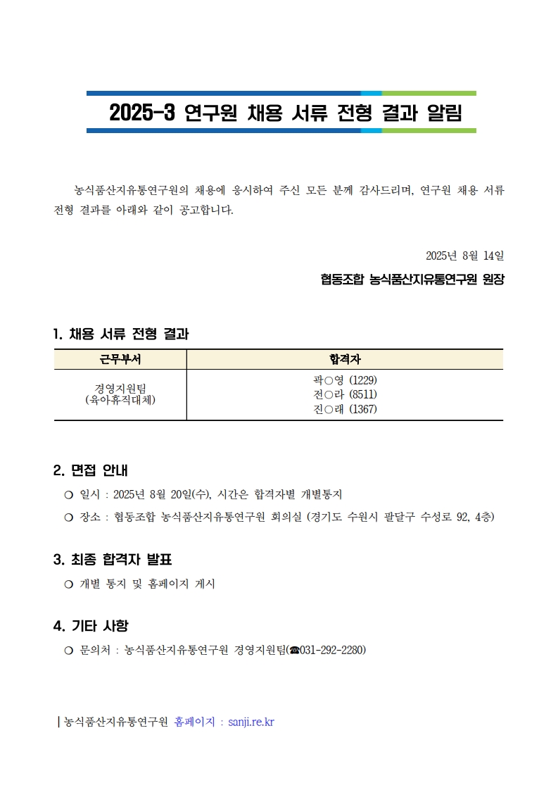 2025-3 경영지원팀원 채용 서류전형 결과 알림